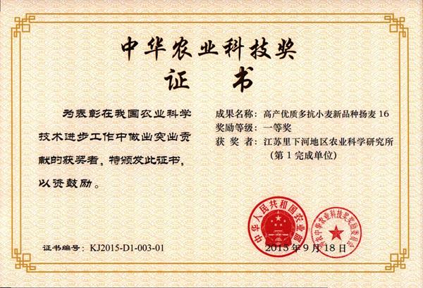 扬麦16,系江苏里下河地区农科所育成的高产优质多抗小麦品种, 2004年通过江苏省审定,2005年获植物新品种权,2009年通过上海市审定。2009年以来一直被列为农业部和江苏省主导品种,是长江中下游麦区唯一连续六年被列为主导品种的中筋小麦品种。扬麦16实现了产量和抗性的综合提高,磨粉品质、理化品质和蒸煮品质的全面改良,提升了长江下游麦区中筋小麦品质水平。2011年以来在江苏省种植面积稳定在500万亩以上,是近6年来年推广面积最大的小麦品种。在长江下游年最大推广面积895万亩,累计种植5742.4万亩,增产粮食16.3亿公斤,创经济效益31.2亿元(2013、2014为11.6亿元),促进了农业增产农民增收,对推动我国粮食“十连增”,保障粮食安全发挥了重要作用。