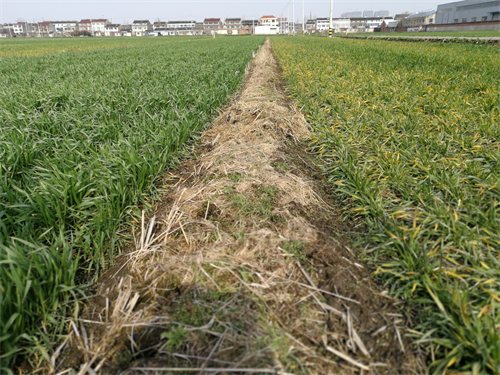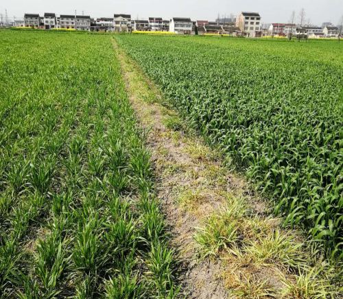 去年秋播江苏淮南麦区不少地方小麦播期提前,为近年来最早的年份,也是适期早播面积最大的年份。遇冬季温度偏高和连续阴雨,禾谷多黏菌休眠孢子萌发和侵染小麦条件有利,不少地方小麦黄花叶病毒病较重。2月16日长江中下游小麦生物学与遗传育种重点实验室研究人员前往泰兴张桥镇调查,发现田间病害较重(图1),建议农户施用速效肥,缓解危害,恢复生长。3月18日重点实验室高德荣研究员和陆成彬研究员再次前往调研,在施用15公斤/亩尿素后,小麦已基本恢复正常(图2)。