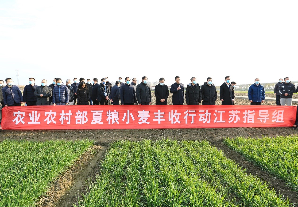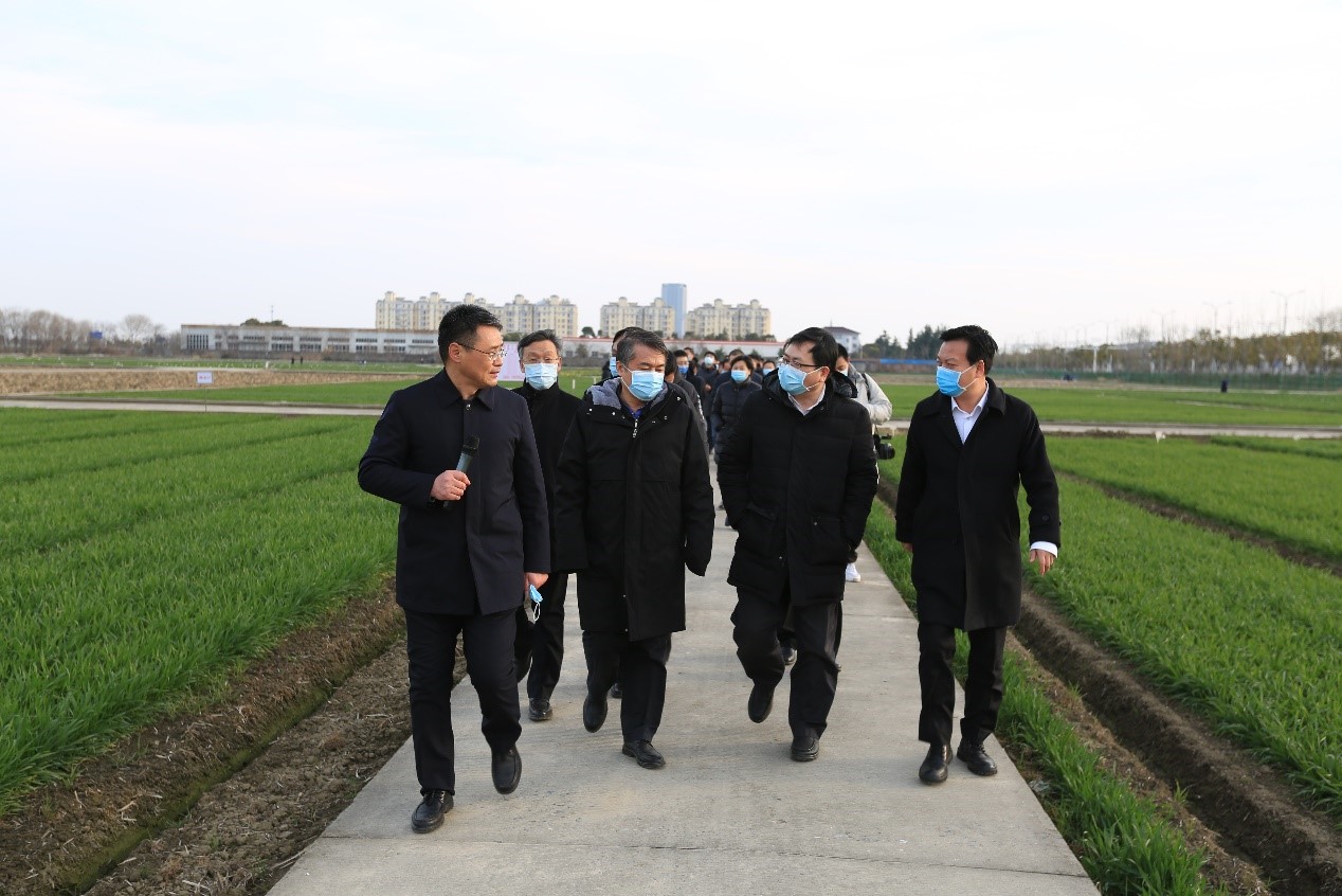 2月20日,夏粮小麦丰收行动江苏指导组农业农村部党组成员、中国农业科学院院长吴孔明院士,率领农业农村部法规司司长王乐君、科教司司长周云龙、科技发展中心主任杨礼胜等领导,科技服务组中国农科院成果转化局局长赵玉林、中国农科院副研究员肖永贵等专家前来本实验室调研指导。省农业农村厅总农艺师唐明珍,扬州市副市长张礼涛,江苏省植保站站长田子华和农技推广总站副站长王龙俊,扬州市农业农村局党组书记、局长雍有瑜,总农艺师丁涛等陪同调研。 国家小麦改良中心扬州分中心/农业农村部长江中下游小麦生物学与遗传育种重点实验室依托单位江苏里下河地区农科所所长李爱宏、党委书记陈贵江陪同调研。