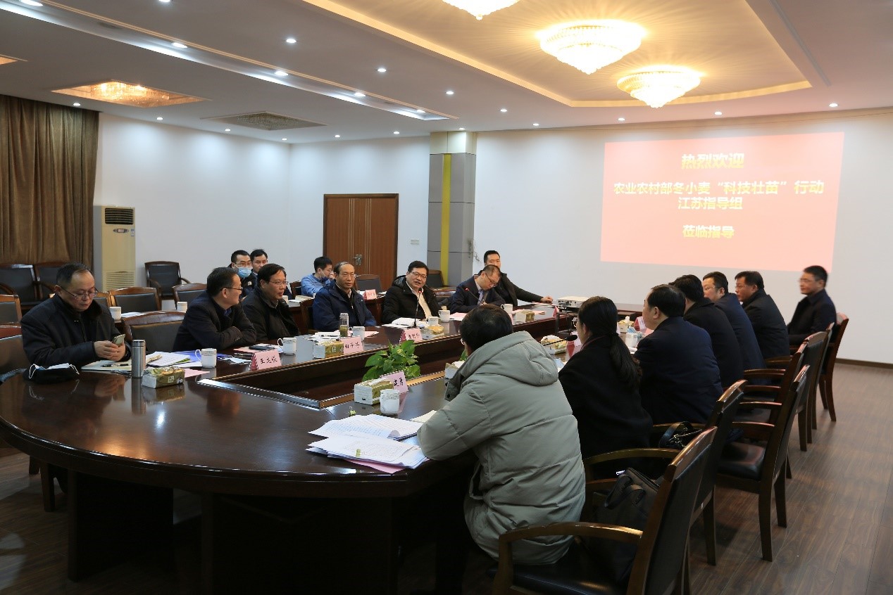 农业农村部法规司司长王乐君主持调研座谈会议。实验室主任高德荣研究员作了“科技壮苗 扬麦品种在行动”的专题汇报。专家组围绕春季管理、政策落实及防灾减灾等工作与江苏省、市领导和专家进行了交流,对各项工作给予肯定并提出意见和建议。国家小麦改良中心扬州分中心/农业农村部长江中下游小麦生物学与遗传育种重点实验室主要科技人员参加了调研活动。
